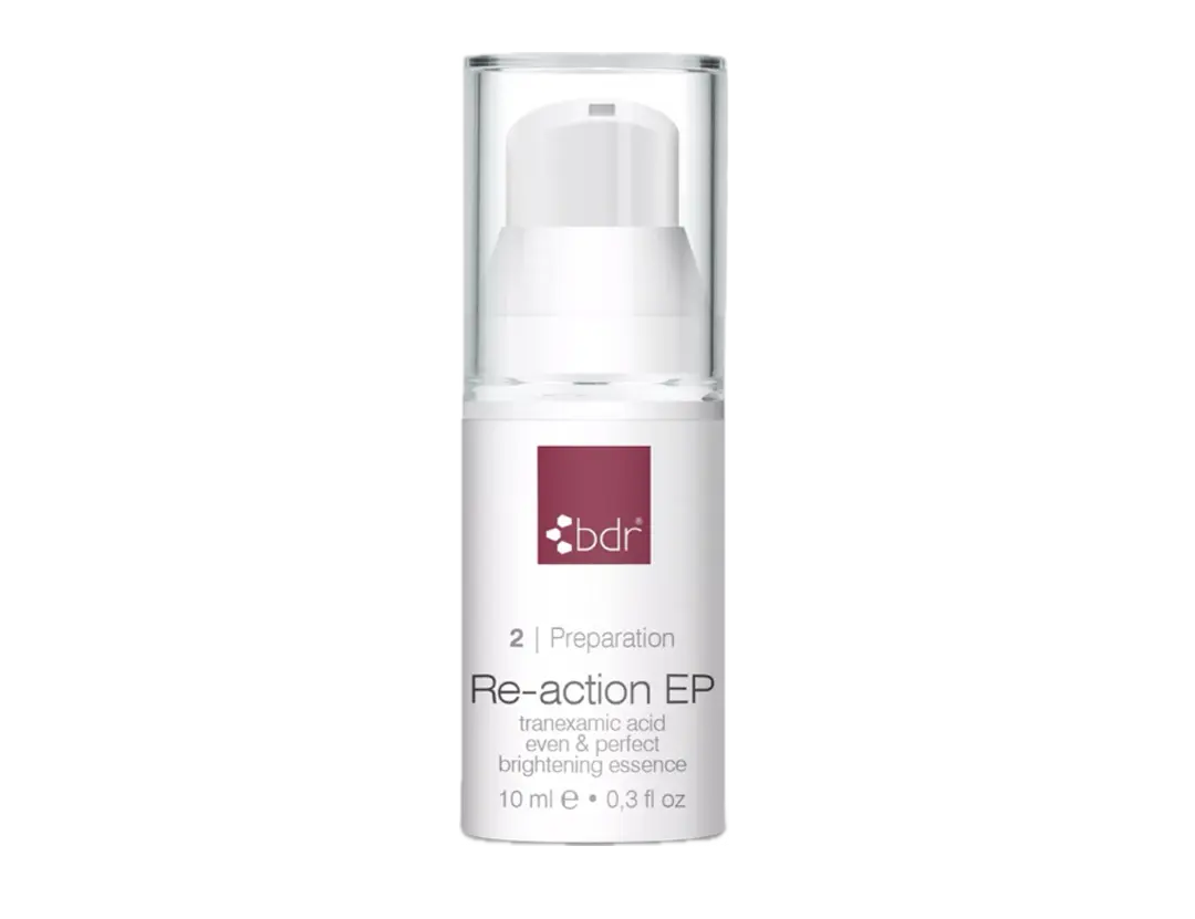 Re-action EP ist ein leichtes leave-on Fluid und wirkt gegen alle Arten der Hyperpigmentierung. 2,5% Tranexamsäure (TXA) in Kombination mit 4% Niacinamid (aktives Vitamin B3) bilden das hochwirksame Powerduo, welches Alters- und Pigmentflecken verschwinden lassen kann und Ihrer Haut eine ebenmäßige Ausstrahlung schenkt. Die aufhellende Essenz ist für jede Haut geeignet und wird kombiniert mit dem zugehörigen Brilliant EP Brightening Serum und der abschließenden Pflege Re-vital EP.